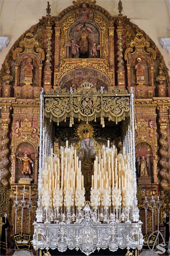 Arte Sacro. María Santísima de la Estrella luce entronizada en su paso bajo el palio que diseñara Antonio Garduño y ejecutó el taller de Fernández y Enríquez de Brenes (1995). - Lleva saya atribuida a Rodríguez Ojeda en los años 20, enriquecida en el taller de Carrasquilla y pasada a nuevo soporte de tisú de plata por Fernández y Enríquez en 1999; manto de salida diseño de Edmigio Serrano Dávila bordado por Consolación Sánchez en 1873 y adquirido a Juan Manuel Rodríguez Ojeda en 1908 y toca de sobremanto del taller de Santa Bárbara (2024) bordada en oro y sedas de colores con motivo del XXV aniversario de la Coronación Canónica. - Sobre sus sienes porta la corona de oro diseñada por Juan Borrero y ejecutada por Orfebrería Triana para la Coronación Canónica en 1999. En su mano derecha, como cada Domingo de Ramos, porta la reliquia del Santo Lignum Crucis, recientemente restaurado por Joyería Mill.