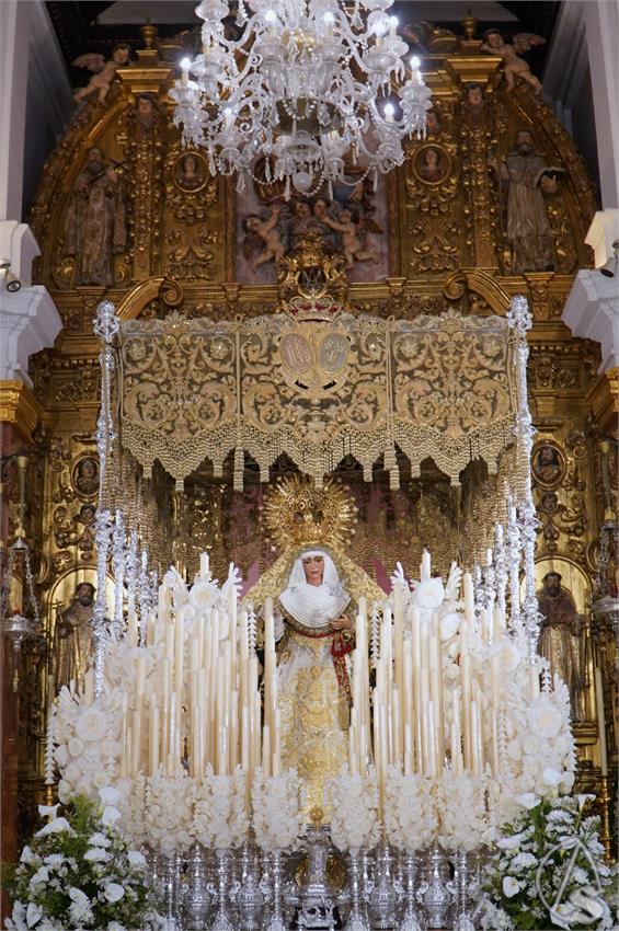 Arte Sacro. Nuestra Señora de la Esperanza se presenta a sus devotos y fieles entronizada en su paso de palio a la espera de una nueva Madrugada del Viernes Santo, en la cual la hermandad se hará cofradía para realizar la estación de penitencia a la Santa, Metropolitana y Patriarcal Catedral de Sevilla y a la Real Parroquia de Señora Santa Ana.