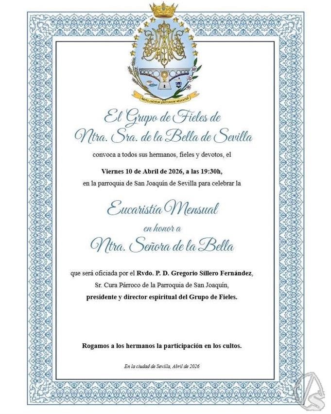 Arte Sacro. El Grupo de Fieles de Ntra. Sra. de la Bella de Sevilla comunica que la misa mensual en honor a la Virgen de la Bella se celebrará el próximo viernes día 10 de abril, a las 19,30 horas, en la parroquia de San Joaquín (calle Papa Juan Pablo I, s/n).