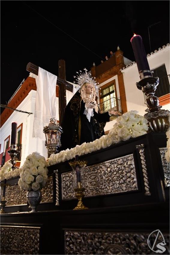 Nuestra Señora del Real procesionó sobre el paso adquirido en 2024 a la Hermandad de las Penas de Puente Genil. Esta bella dolorosa se venera todo el año en la Iglesia de San Antón, donde cuenta las crónicas que tuvo su campamento el rey Santo antes de entrar en la ciudad de Carmona.