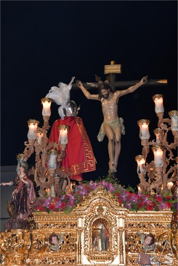 En el primero de los pasos procesiona el Santísimo Cristo del Perdón, obra de Francisco Velasco Barahona. Acompaña al Crucificado la talla de un soldado romano que contempla como Cristo perdona a su pueblo. Bajo palio procesiona María Santísima en su Mayor Dolor, obra del mismo autor que el crucificado, siendo bendecidas ambas tallas el 5 de abril de 1981.