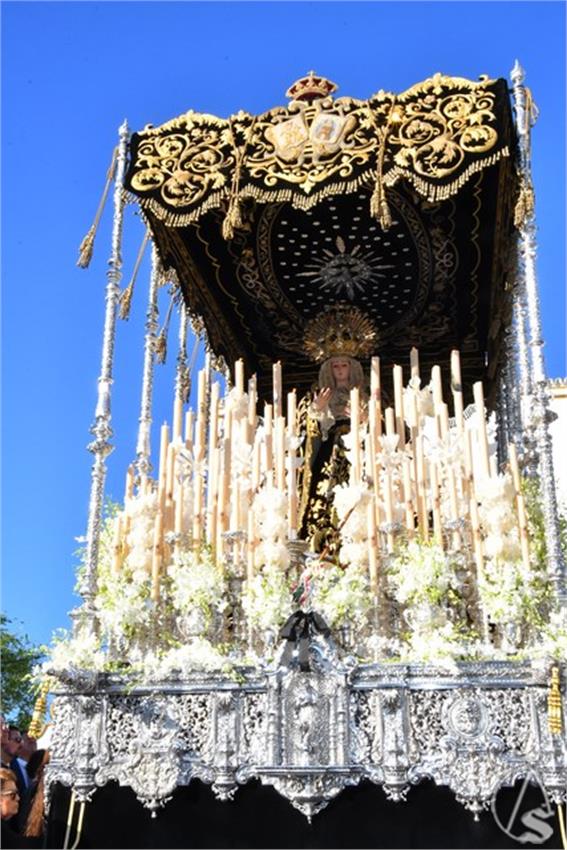 Cierra el cortejo la venerada imagen de la Patrona y Alcaldesa Perpetua de Cantilana, Nuestra Señora de la Soledad Coronada, obra de Juan de Santamaría del año 1583. La Santísima Virgen fue coronada el 25 de mayo de 2024.