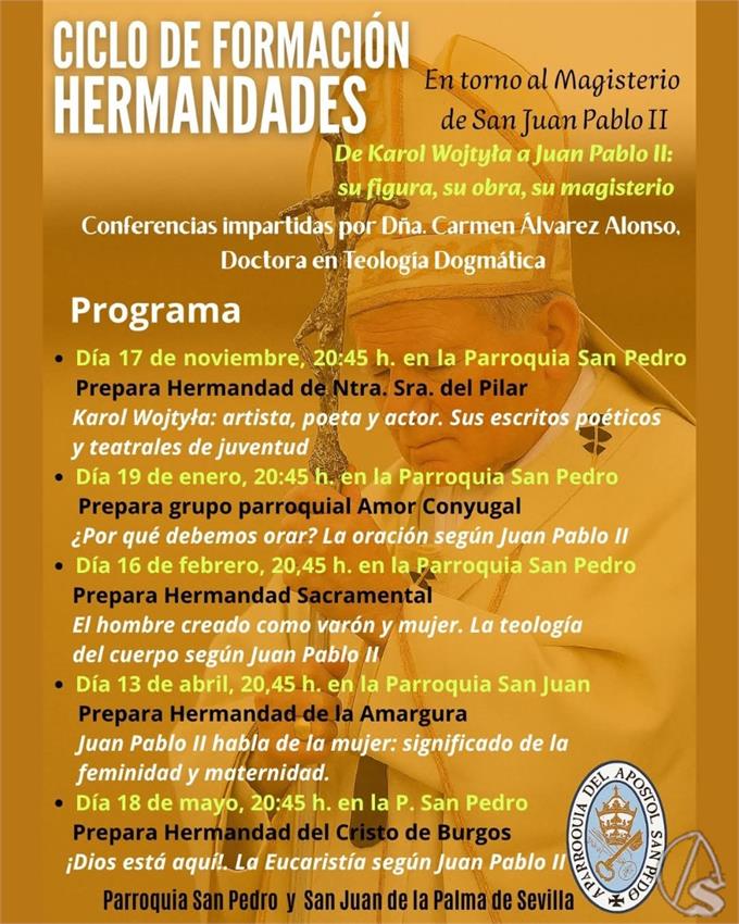 Las conferencias, que vienen celebrándose desde el mes de noviembre en la Parroquia de San Pedro, son impartidas por la doctora en Teología Dogmática, Carmen Álvarez. Cada sesión, en las que ya se ha abordado la faceta artística de Wojtyla, su oración o sus catequesis sobre Teología del Cuerpo, está organizada por una hermandad con sede en esta parroquia sevillana.