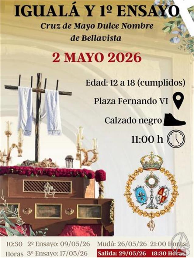 Arte Sacro. El sábado 2 de mayo, a las 11:00 horas, tendrá lugar en la Plaza Fernando VI la igualá y primer ensayo de la Cruz de Mayo de la Hermandad del Dulce Nombre de Bellavista.