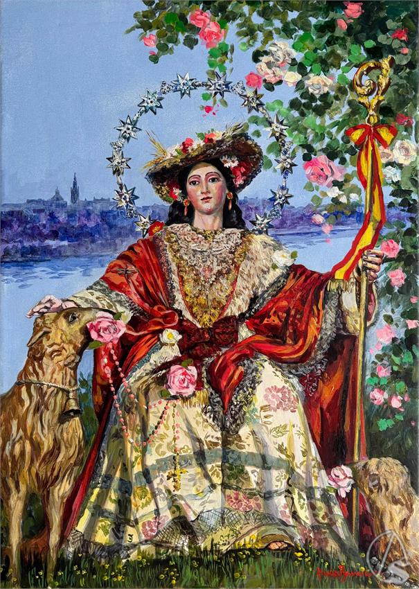 Seguidamente, se procedió a la presentación de la pintura que ilustrará la portada del libro del pregón, obra de la artista Nuria Barrera. La obra presenta a la Divina Pastora de Triana como protagonista central, ataviada con rica indumentaria y rodeada de un delicado entorno floral, sosteniendo su cayado y acompañada de sus ovejas, en clara alusión a su iconografía tradicional. La colorida escena se sitúa en la emblemática calle Betis, con el perfil de Sevilla y el río Guadalquivir al fondo, configurando una imagen de profunda identidad trianera y marcado carácter simbólico.