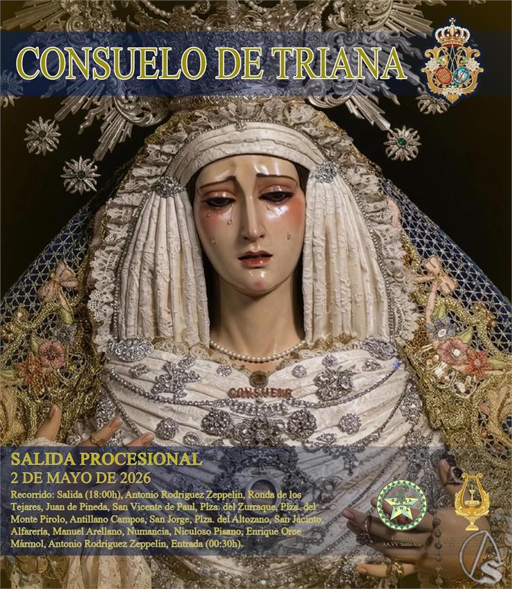 Arte Sacro. El próximo día 2 de mayo, tendrá lugar la salida procesional de Nuestra Señora del Consuelo por las calles de Triana, con el acompañamiento musical de la Sociedad Filarmónica de Pilas.