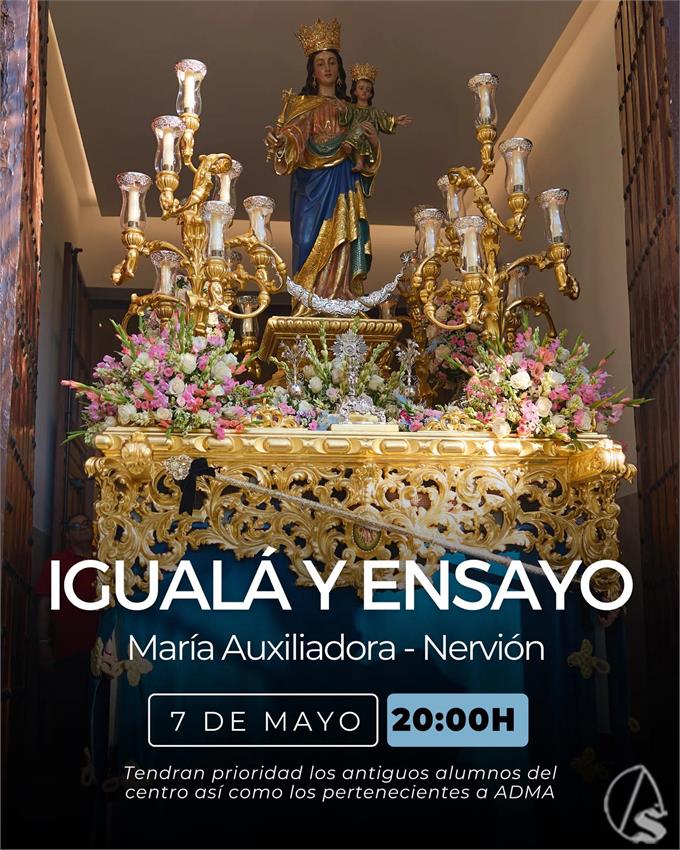 Arte Sacro. El próximo jueves, 7 de mayo, tendrá lugar la igualá, seguida del primer ensayo del paso de María Auxiliadora de Nervión, a las 20 horas, en la capilla del Colegio Escuelas Salesianas María Auxiliadora.
