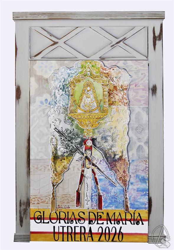 Finalmente en la franja inferior a modo de bandera de la localidad y cenefa de azulejería presenta el texto Glorias de María, Utrera 2026 usando la misma tipografía de la cartelería de las fiestas de primavera de los años 80.