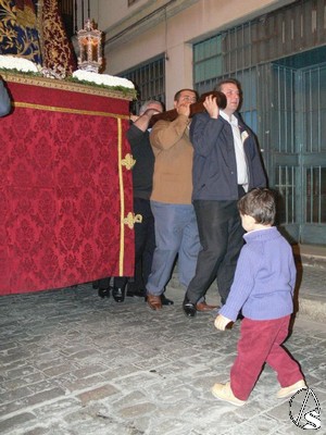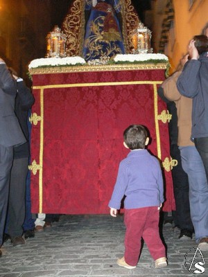 En las fotos lo pueden observar un poco. Pero la cosa era para haberlo visto en directo. Este chiquillo, que no tendrá más de dos años, se situaba delante de las andas de la Virgen del Carmen Doloroso a dar sus instrucciones. Con los brazos abiertos, dando órdenes a los portadores de las andas con “su” peculiar vocabulario de crío. Todo un capataz, vamos.