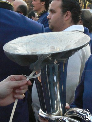 Daniel García Acevedo. Esto que ven en las fotos es un invento de un músico de la agrupación musical Ntro. P. Jesús de la Salud (los Gitanos), llamado Carlos, para que no entren en el agujero del gran instrumento de viento ningún caramelo, plásticos u otra cosa de las que se lanzan en una cabalgata.