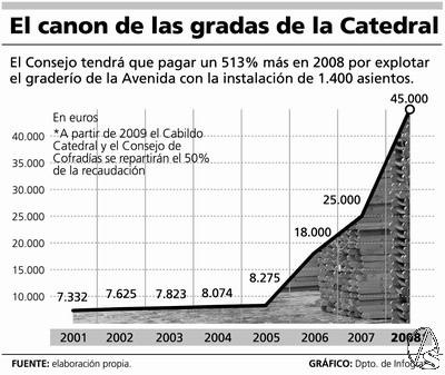 Y bien lo sabe el canónigo Francisco Navarro , que le ha reclamado al Consejo la parte que le corresponde en el negocio como propietario de una superficie que alberga 1.407 sillas. Esta jugada maestra ha puesto a temblar las cuentas del Consejo, acostumbradas al chollo de las gradas hasta el año 2005. Si el Consejo le quitó el negocio del siglo a los silleros evolucionando hacia la autogestión, el Cabildo Catedral le ha hecho probar la misma medicina quitándole a golpe de convenio el maná de las gradas de la Avenida, donde la rentabilidad ha rozado las cifras que volverían loco a cualquier emprendedor. Se acabó lo que se daba. El Consejo ha pactado unas condiciones de pago que dan lugar a una gráfica que se parece más a un puerto de primera categoría del Tour de Francia que a la Cuesta del Rosario.