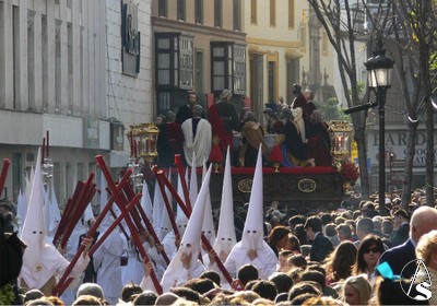 El misterio de la Sagrada Cena discurrió por el inicio de la carrera oficial con las marchas “Refúgiame” y “Eucaristía” andando con un paso largo. En las jarras de claveles rojos aparecían clavadas espigas de carácter eucarístico. El Señor de la Humildad y Paciencia viene acompañado por los niños de la Escolanía del colegio Salesianos de la Trinidad que, con sus voces angelicales, cortejan magníficamente el paso. El exorno del paso eran lirios morados en las jarras y a los lados del Señor aparecían unas flores de varios colores. La Virgen del Subterráneo llegó a la Campana a los sones de la marcha “Noche del Jueves Santo en Sevilla” de la opera Margot de Turina. Todo una delicia para los oídos. La banda de Tejera es la agrupación que acompaña a la hermandad de la Cena desde hace muchos años y este es el primero sin Pepin Tristan. Su hijo, José Manuel, debutaba como director de la banda en la Campana. Posteriormente interpretaron “Virgen del Subterráneo” y “Corpus Chirsti” para, de esta manera, llegar a Sierpes. El retraso en ese momento era ya de 55 minutos.