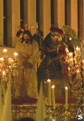 En la calle central la banda Virgen de los Reyes, con los nuevos uniformes, solo interpretó la marcha “Al compás de la Laguna” ya que con un andar ligero y fino a la vez el paso del Señor de Jesús Despojado se metió en Sierpes. El gran estreno del día, el techo de palio restaurado y las bambalinas exteriores bordadas nuevas relucían en ese instante ya que le daba el sol de pleno.