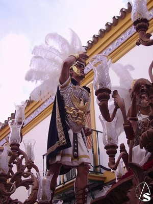 Pues un misterio que encajaría en esta idea sería este que procesiona, no muy lejos de Sevilla, concretamente en La Rinconada, y en el que podemos ver a un Ángel señalando que Jesús ha resucitado y sale del Sepulcro mientras que contemplan la escena dos soldados romanos asombrados por la gloriosa Resurrección al tercer día de Nuestro Señor, imágenes realizadas por el escultor Juan Antonio Blanco Ramos.