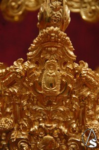 La corona, obra de Orfebrería Triana, tiene detalles que no pasan desapercibido. cómo puede ser el perfil del Nazareno de la O, Santa María de la O, Santa Justa y Rufina, Santa Brígida y las antífonas.