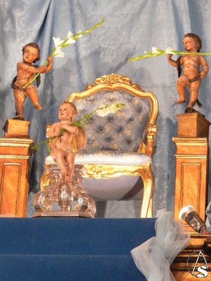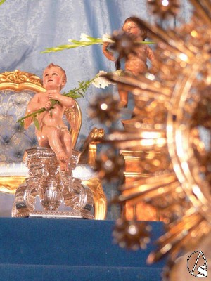 La Virgen de las Nieves se nos presenta en el suelo y tras ella figura una escalera imaginaria con unos ángeles en el camarín de la Señora.