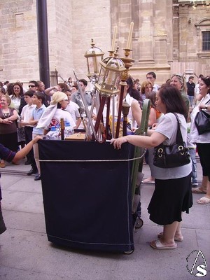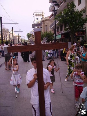 En el cortejo se podían observar algunos tramos con insignias llevados por los mismos niños acompañados de sus padres y niñas vestidas de flamenca, tambien se podían ver niñas de costaleros.