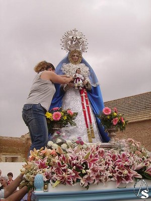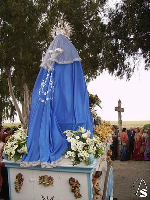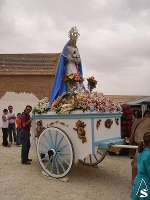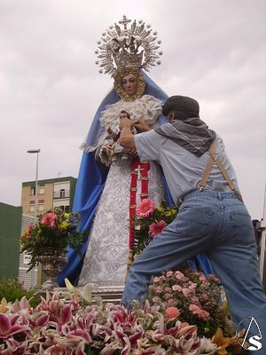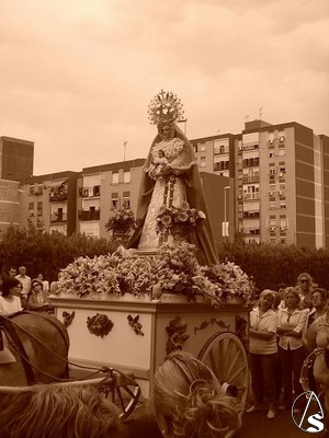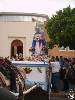 La Virgen salía a las nueve en unas andas que con mayor dificultad que otras veces eran colocadas minutos más tarde en la carreta para poder iniciar el camino, que tras recorrer varías calles de la barriada le llevaría hacia la Ermita La Alegría.
