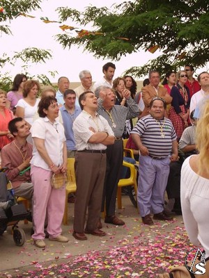 Como cada año y tras el rezo del Angelus el párroco D. Francisco impone la medalla de la Virgen a los nuevos integrantes de la comunidad franciscana, a partir de ahí a la Virgen le sorprende de nuevo la lluvia, pero en este caso de petalos de flores.