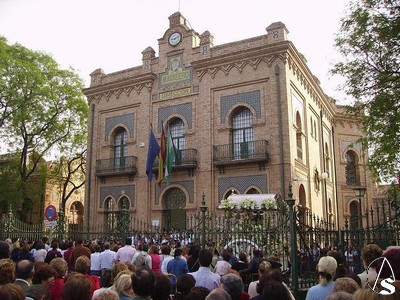 Una vez recorridas diversas calles del barrio, la primera parada la tuvo en el interior del colegio Ortiz de Zuñiga, más conocido como el Matadero, y donde un año más los niños del centro dedicaron al Simpecado una salve interpretada con sus flautas, el recitar de algunas poesias dedicadas a la Virgen y el baile y cante de sevillanas para una vez concluido todo reanudar su marcha por las calles Alcalde Juan Fernández, General Merry y Felipe II para cruzar el Puente de las Delicias, la Feria e introducirse en el Aljarafe.
