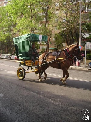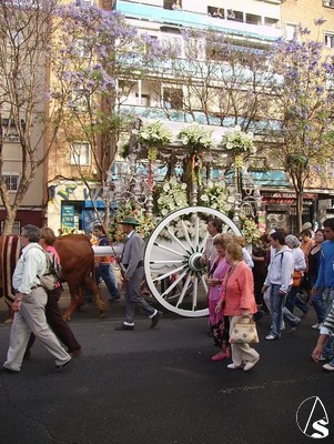 Una vez terminada la misa en la parroquia de Nuestra Señora de los Dolores el simpecado fué trasladado hacia su carreta de plata que se realizara en los talleres de Viuda de Villarreal e iniciar su recorrido por Sevilla camino de la Ermita.