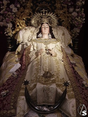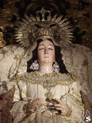 Para los cultos de la festividad de la Asunción se traslada al Altar Mayor colocándose en una cama del más delicioso estilo rococó vestida con bonitos mantos y alhajas rodeada de Niños Jesús vestidos de querubines, jarrones novecentistas o chinescos con flores y candelería de plata, formando todo ello un conjunto admirable.