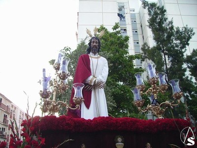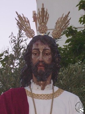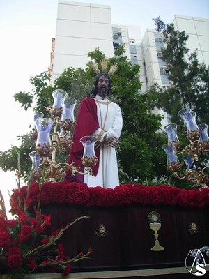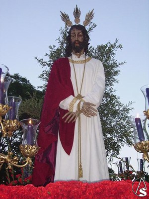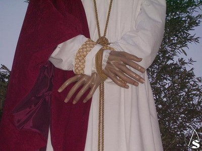 Este año el Cristo aparecía tal y como se nos presentó como novedad el año pasado, es decir con túnica blanca y mantolin rojo y un olivo en la trasera del paso, representando el momento en que Jesús es prendido en el huerto de los olivos.