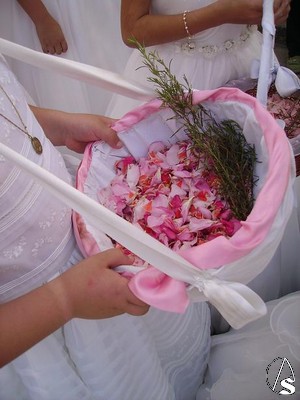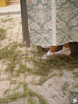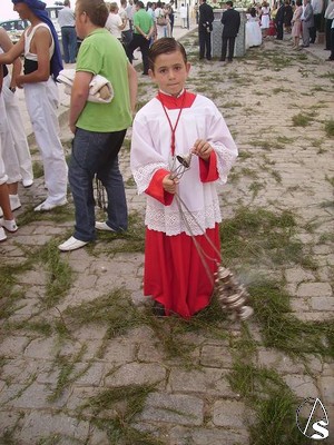 Le sigue el paso del Niño Jesús y si tras el patrón iban los niños vestidos de Comunión ahora es el turno de las niñas, repartiendo ramitas de romero y pétalos de rosa a los fieles.