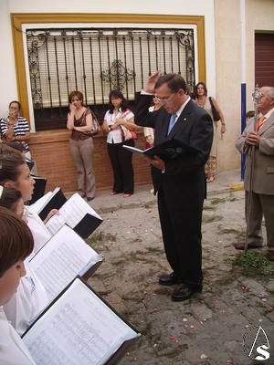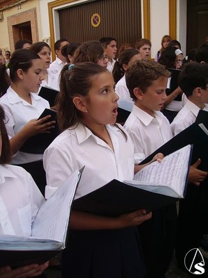 Mujeres de mantilla blanca, el coro infantil de la Escolanía de Los Palacios y los ciriales y monaguillos precedían al paso de la Custodia en el que Jesús Sacramentado procesionó por las principales calles del pueblo ante los tradicionales balcones engalanados para la ocasión.