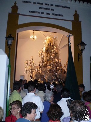 Una vez llegado el Simpecado de la hermandad a la Ermita tras hacer su recorrido en Rosario desde la parroquia de San Martin Obispo, la Santisima Virgen de Consolacion Patrona de los Carrioneros, hacía su salida sobre las 11 de la noche del miercoles entre el fervor de una gran multitud de devotos y hermanos que aguardaban a las puertas de su templo para dirigirse a la iglesia del pueblo y acompañar al Santisimo Sacramento el dia del Corpus Christi en Procesion por las calles del pueblo, siguiendo tradicion inmemorial.