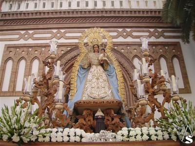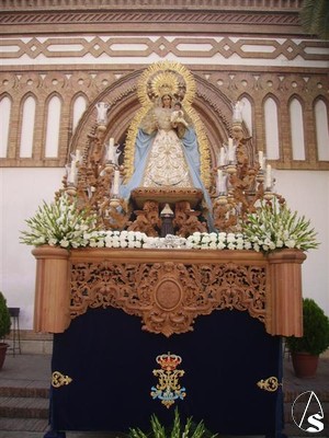 A las diez y media de la mañana se abrían las puertas del colegio de La Salle para todo aquel que quisiera contemplar a Madre de Dios del Dulce Nombre expuesta en su paso de salida, a la espera de comenzar su procesión por la feligresía a partir de las ocho de la tarde y recorrer las calles de los barrios cercanos.