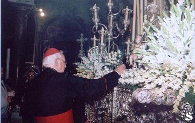 Arte Sacro. El Cardenal arzobispo de Sevilla, Carlos Amigo Vallejo, estuvo presente en la salida procesional de la Virgen de las Nieves el pasado domingo 21 de octubre por el 275 aniversario fundacional de la hermandad de gloria.