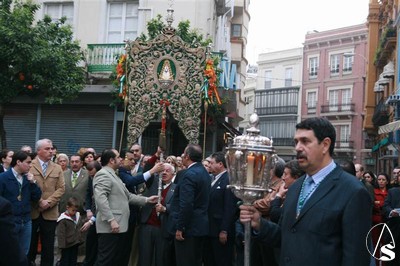 A la finalización de la santa misa (aprox. 21.00 horas): Solemne traslado de la amantísima titular la Stma. Virgen del Rocío a la Iglesia Colegial del Divino Salvador, siendo portada en andas por sus hermanos y devotos. Itinerario: Luchana, Cuesta del Rosario, Plaza Jesús de la Pasión, Córdoba y Plaza del Salvador, teniendo prevista la entrada en el templo a las 22.30 horas aproximadamente.