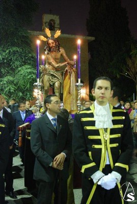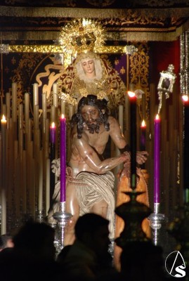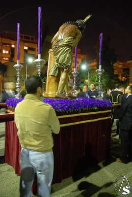 La imagen que tallara Buiza es portada en unas andas con cuatro cirios morados y exornado por lirios del mismo color.