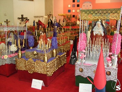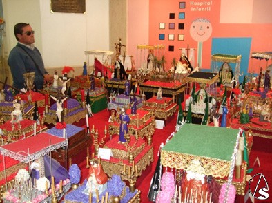 Más tarde, ya en la Unidad, la profesora de los niños, Ana, les hizo entrega de un diploma por haber participado en la exposición de Pasos en Miniatura. Una muestra sita en el vestíbulo del Hospital Infantil del complejo hospitalario, que contiene pasos y figuras de Semana Santa realizadas por los pequeños ingresados con la ayuda de sus padres, los maestros y voluntarios del Hospital Infantil, y que quedará expuesta durante toda la Semana Santa. Gran parte de los objetos utilizados en la exposición Pasos en Miniaturas son materiales reciclados. De esta forma, los pasos son cajas de suero, los candelabros y maniquetas son jeringuillas y botes de suero fisiológicos, los candelabros son tornillos y tuercas, los floreros botes de antibióticos, los embellecedores topes de puertas y los nazarenos de papel reciclado, además de utilizarse otros elementos, como cáncamos, chinchetas y canillas de máquinas de coser. Par los pasos de Virgen, algunas madres ha aportado pendientes y demás abalorios de bisutería. En resumen, un escenario muy particular y especial creado en el hospital para el disfrute de grandes y pequeños.