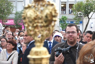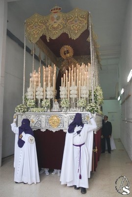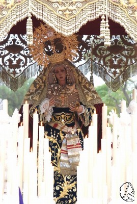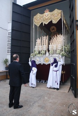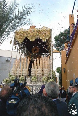 De nuevo continuaron saliendo los tramos de nazarenos del palio hasta completar los, aproximadamente, 200 hermanos que lucieron túnica. Maruja Vilches estuvo presente y no quiso perderse a su cofradía, de la que tuvo parte importante en sus comienzos. Nuevamente el Cardenal Amigo y el hermano mayor, Antonio Jiménez, se dirigieron a los costaleros y la levantá inicial la realizó nuestro Pastor, como hiciera en el paso de misterio. El paso de palio saldría a las 18,45 horas a los mandos de José Manuel Fajardo Villegas. La Virgen lucía una saya bordada color azul oscuro que, junto con el tocado de color crudo resaltaban más las facciones hermosas de la Stma. Virgen. En el tocado lucían cuatro mariquillas. La Virgen salió a los sones de la marcha real y, tras esta, fueron interpretadas las marchas “Coronación de la Macarena” y “Pasan los Campanilleros” interpretadas por la banda de la Cruz Roja. A la salida le fue lanzada una petalada a la Stma. Virgen del Amor.
