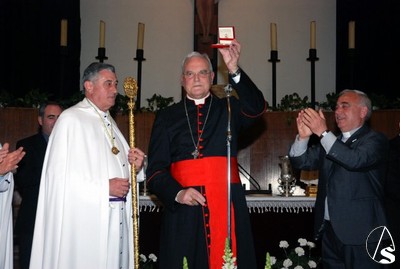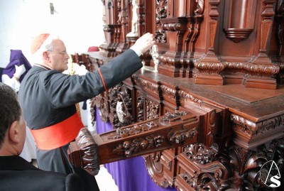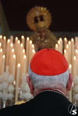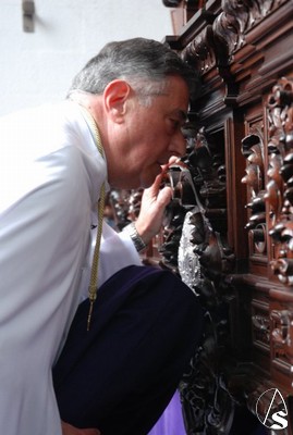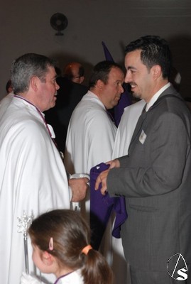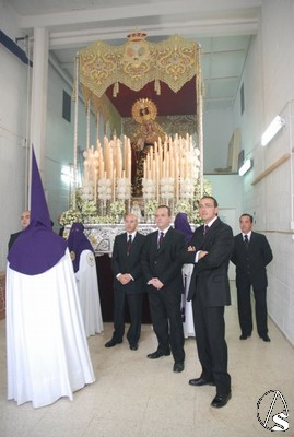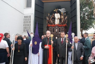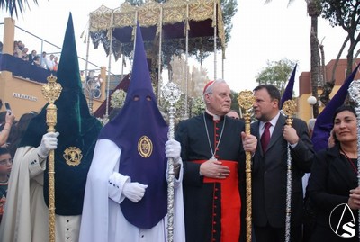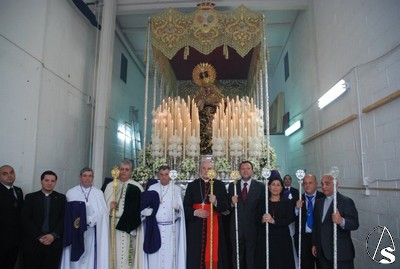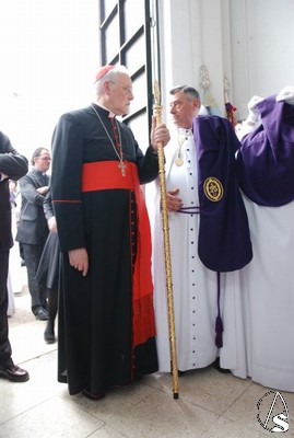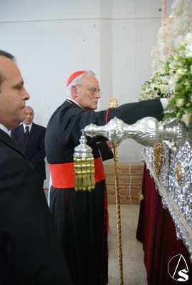 Todo el cortejo que iba a acompañar a los titulares se encontraba en el interior de la parroquia de San Isidro Labrador hasta que 10 minutos antes de las 6 de la tarde, hora fijada para el inicio de la procesión llegó el Cardenal Amigo Vallejo que dirigió unas palabras a los hermanos en las que recordó las buenas relaciones entre la hermandad y la parroquia y las obras de caridad para con los más necesitados en las que está involucrada esta hermandad. Como recuerdo de esta fecha, el Sr. Cardenal entregó al hermano mayor, Antonio Jiménez, un presente consistente en la medalla conmemorativa del 25 aniversario como arzobispo de Sevilla, primera que le ha regalado a una hermandad.