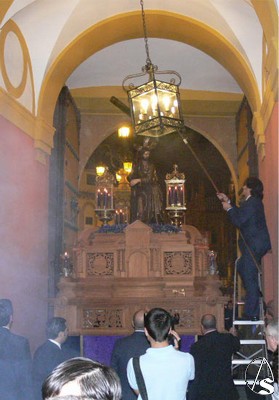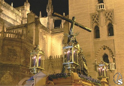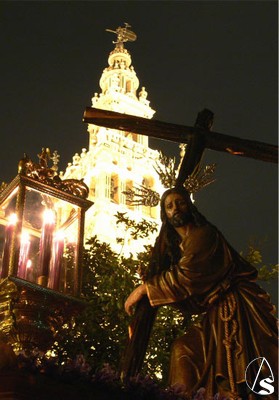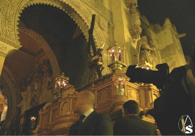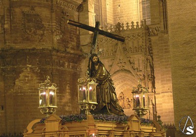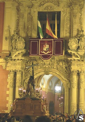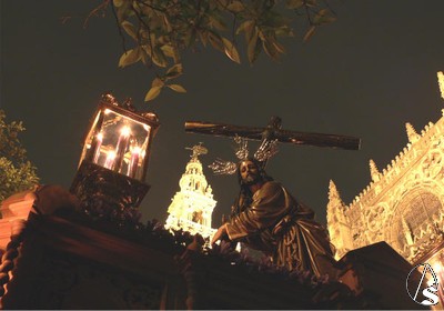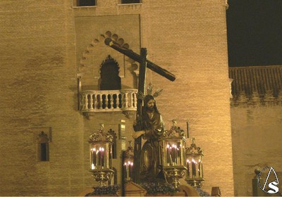 Nada más salir del Sagrario, se encontraron con un primer escoyo, los árboles del patio de los naranjos no habían sido podados, con lo cual tuvieron que quitar la parte superior de la nueva cruz y salvar las ramas con cierta dificultad hasta llegar a las inmediaciones de la Puerta del Perdón, donde de nuevo colocada, vio el Titular como Sevilla le esperaba.