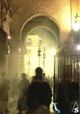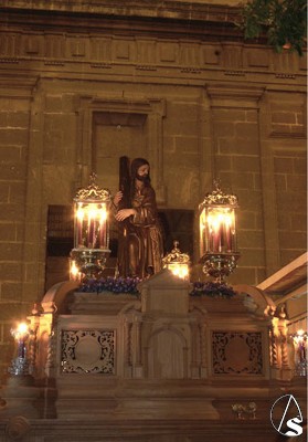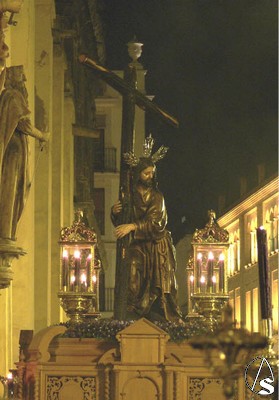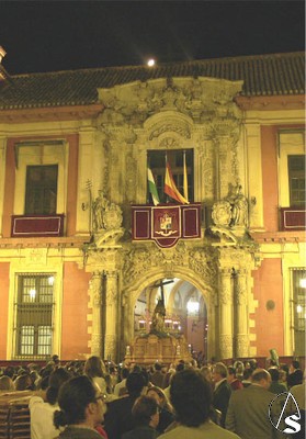 Francisco Santiago. Las obras que se están realizando en el recinto del Palacio Arzobispal impidieron que el Cristo de la Corona pudiera entrar hasta el patio del Palacio Arzobispal, aunque el paso, no sin dificultad, llegó a traspasar la puerta principal de entrada, salvando el gran farol de forja que la preside.