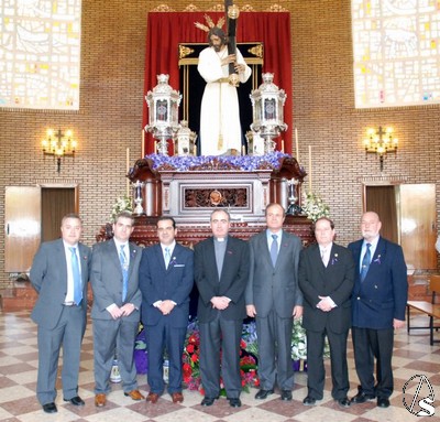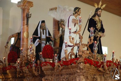 En el Parque Alcosa recibían la visita del presidente del consejo de cofradías, Manuel Román y del delegado diocesano de hermandades, Manuel Soria, que estos días se patean la ciudad visitando a las hermandades que procesionan por la tarde. El Señor luce túnica lisa blanca y no la habitual morada, como novedad más destacada de este año. Los broches de los faldones bordados solo los podremos ver este año en la delantera del paso y los evangelistas de las esquinas se quedarán sin salir por problemas a la hora de la pátina.