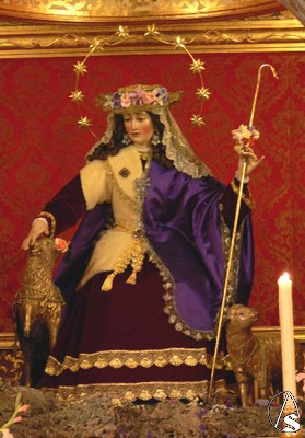 Por este motivo, la Divina Pastora, ha lucido el tradicional manto morado con encajes de plata. Así mismo ha estrenado una nueva saya de terciopelo Burdeos, con encajes de oro, a modo de registros, muy al gusto del Siglo XIX.