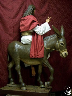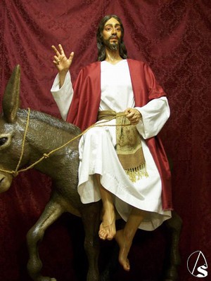 Arte Sacro. El imaginero Juan Carlos Vázquez Pichardo entregó hace unas semanas, la nueva imagen que se estrenó el pasado Domingo de Ramos por la calles del pueblo jiennense de Rus. El conjunto ha sido tallado completamente en madera de cedro, posteriormente policromado y patinado al óleo. El Señor y burra incluidos, miden 205 cm.