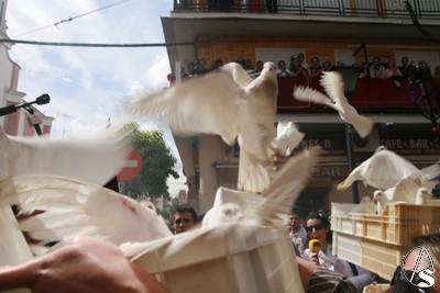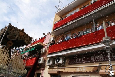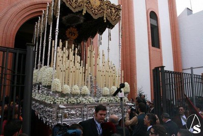 Juan Antonio Guillén, al que nos agrada enormemente verle de nuevo al frente de la cuadrilla de costaleros de su Virgen de los Dolores, mandaba el paso hacía la puerta y por ella salía la presidencia con el hermano mayor al frente y el alcalde de Sevilla, Alfredo Sánchez Monteseirín, que no se pierde ningún año la salida del Cerro. En el atrio, esperando a la Señora, gente tan distinguida del barrio como el escultor Juan Manuel Miñarro o Salvador Távora. A las 12,50 horas salió la Virgen de los Dolores bajo una fuerte ovación de todo el barrio, a los sones de los himnos de Andalucía y el de España. Tras estas interpretaciones la primera marcha en tocar la banda de música Ntra. Sra. de las Nieves de Olivares fue “Coronación” de Manuel Marvizón, que también estaba presente, y que realizara para la coronación canónica de la Virgen de los Dolores. Desde un balcón se le iban lanzando pétalos de distintos colores a la Virgen hasta llegar a la calle Afán de Rivera. Después de una nueva levantá la Virgen se gira hacía la parte del Cerro a la que le dará la espalda para abandonarlo con dirección a la Catedral. En esos momentos la emoción que, a duras penas, se había contenido, rebosa en los ojos de todo el mundo. Aquí lloran de alegría desde las señoras más mayores y que han visto a la hermandad cuando era de gloria, hasta los costaleros de reserva. Desde los auxiliares de la hermandad hasta las personas que por primera vez vienen a ver esta salida. A los sones de “Pasan los Campanilleros” y ya con el paso de frente en Afán de Rivera se sueltan unas palomas que hacen, de nuevo, que las palmas echen humo.