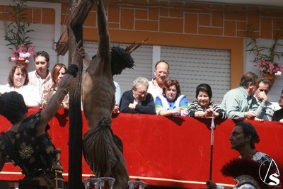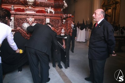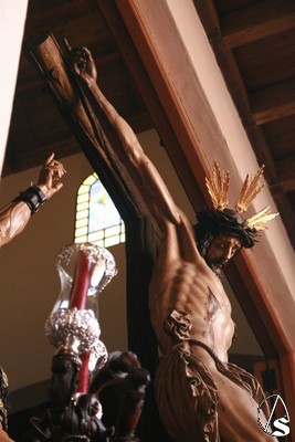 Mientras el paso de misterio era colocado en la puerta de la iglesia terminaban de salir la presidencia y los acólitos. La levantá que puso al Señor del Desamparo y Abandono en la calle la realizó José María Ruiz Romero, hermano mayor del Cachorro. Según les dijo Paco Reguera a sus costaleros, esta hermandad donó la pila bautismal de la parroquia de los Dolores. El paso se puso en la calle a las 12,10 horas con gran entusiasmo por parte de todos los vecinos y devotos de Señor. Este año el crucificado iba estrenando una Cruz nueva realizada por Fco. J. Verdugo y Enrique Lobo que se encontraban ambos viendo la salida desde el atrio de la parroquia sensiblemente emocionados. También se estrenaban la restauración y nuevo barnizado de los candelabros del paso, realizada también por Enrique Lobo. La banda de cornetas y tambores Ntra. Sra. del Sol interpretó dos composiciones del repertorio clásico mientras, el paso de una sola chicotá se quedaba en la intersección con la calle Afán de Rivera. Desde un balcón que hay frente a la parroquia, la saetera Isabel Navarro le cantaba una saeta, mientras era izada la cruz que hay que bajar para la salida. Al levantarse el paso nuevamente las palmas pusieron la despedida hasta que por la noche regrese al barrio el Stmo. Cristo del Desamparo y Abandono.