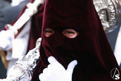 Los nazarenos del paso de palio se precipitaban por la puerta cuando observamos al nazareno de la Humildad contemplando impasivo la escena. No sabemos si lo veremos procesionar algún día aunque cada vez son más los fieles que se acercan a rezarle durante todo el año.