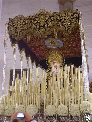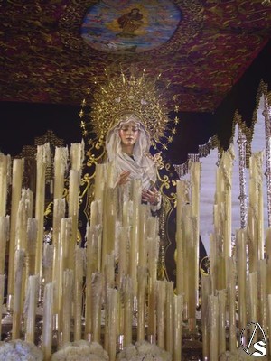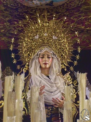 La segunda de ellas fue cuando entré en Omnium Sactorum, para mi sorpresa y seguro que para algunos más la Virgen de Gracia y Amparo estaba en su paso de palio pero con una diferencia, y es que en vez de su corona de salida que tenía el día anterior, la dolorosa se encontraba con diadema.
