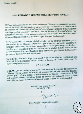 Según ha podido conocer este portal cofradiero, finalizada la visita, Sánchez Monteseirín ha leído, para sorpresa de todos, el acuerdo de junta de gobierno firmado por el propio Alcalde en el que el consistorio sevillano cede definitivamente y por setenta y cinco años los terrenos aledaños a la sede canónica de la corporación para la construcción de la nueva casa de hermandad.