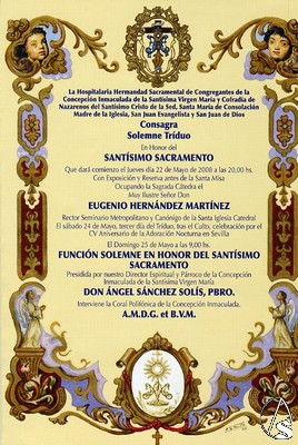 El domingo 25 de mayo a las 09:00 horas, tendrá lugar la función solemne en honor del Santísimo Sacramento, presidida por su director espiritual, Ángel Sánchez Solís, interviniendo la Coral Polifónica de la Concepción Inmaculada.