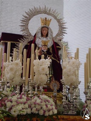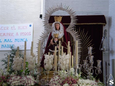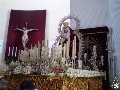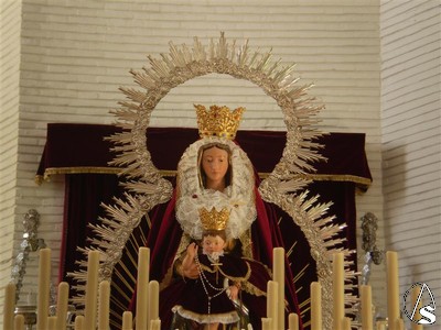 A continuación pueden ver unas fotografías de la Santísima Virgen preparada en su paso realizadas esta misma mañana. Como pueden apreciar, este año la Virgen, una imagen de talla completa, volverá a salir sobrevestida en esta ocasión con el manto burdeos.