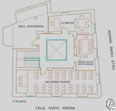 Planta baja : Mayordomía, Secretaría, Archivo-Biblioteca, Grupo Joven, cuarto de limpieza, Office y Aseos, todo ello distribuido desde el patio central y recibidor.